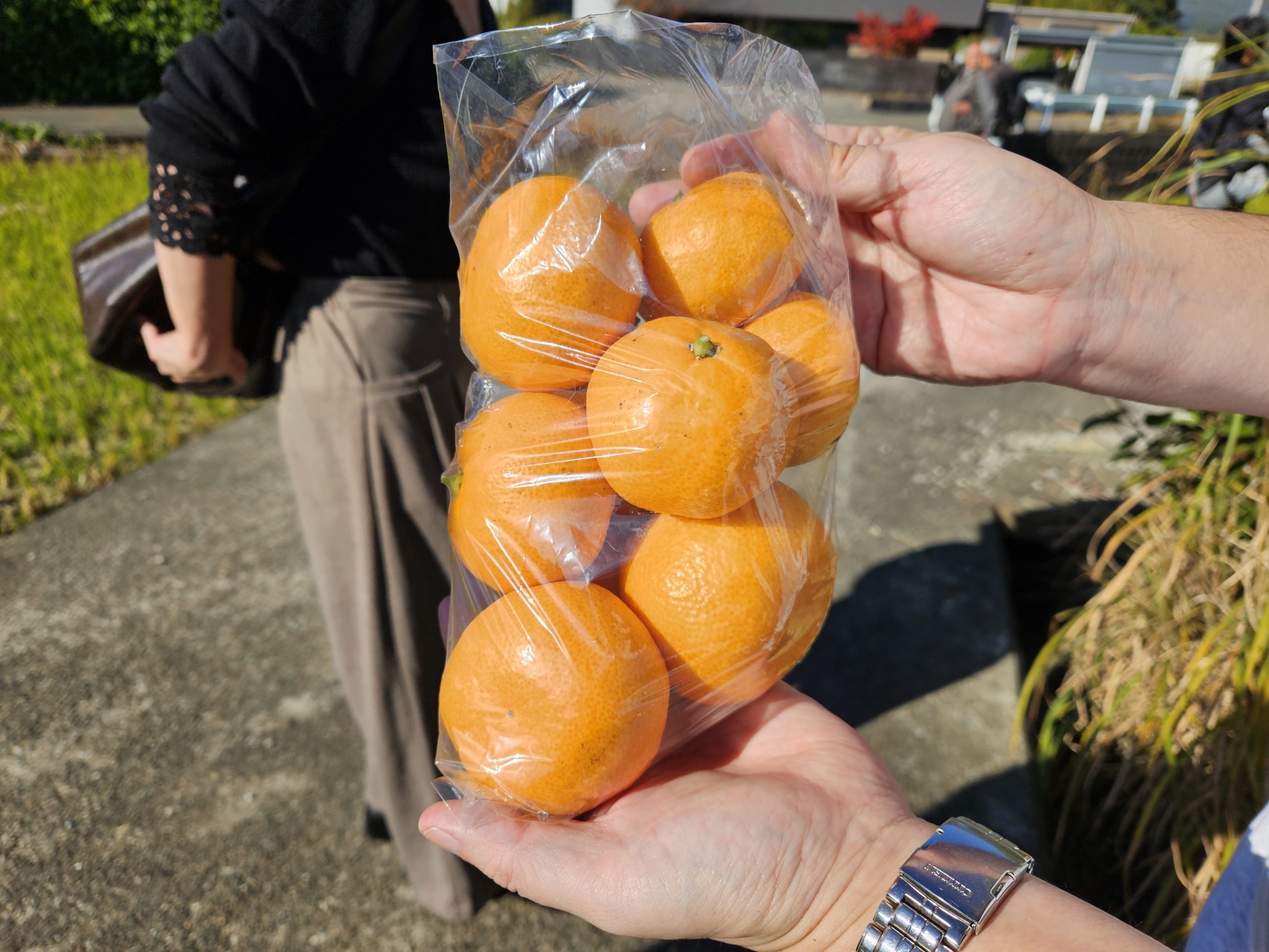 みかんが生っている木に各々向かっていき、直接取ったみかんをその場で食す。小さなみかんが甘くておいしかったですね。一袋100円のビニール袋にみかんを詰め放題して、皆さんお土産としてお持ち帰りをされてました。私は6つしか詰めれなかったのですが、10個近く詰めておられる方もおられました!さすが大阪人、ビニールの伸ばし方をよく知っている!!